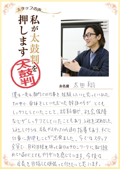 東京にもあこがれがあり、都内に店舗の多い男性専用美容室を見つけたので入社を決めました。